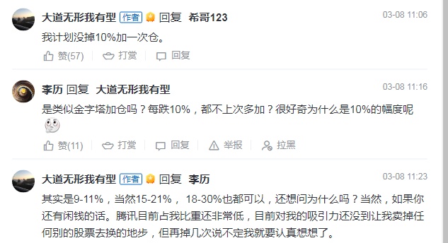 智通财经APP获悉,3月8日中午,段永平再度发声加仓腾讯(00700):“我计划每掉10%加一次仓。”他还补充道:“腾讯目前占我比重还非常低,目前对我的吸引力还没到让我卖掉任何别的股票去换的地步,但再掉几次说不定我就要认真想想了。”