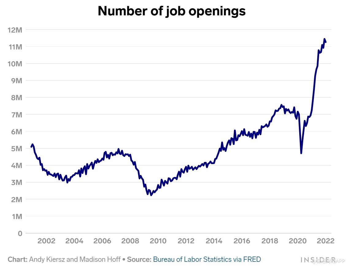 随着就业者寻找新的或更高薪水的工作机会,离职率的提高也给经济复苏带来了压力。根据JOLTS的报告,辞职人数从450万降至近430万。这标志着连续第七个月有400多万美国人辞职。相比之下,在疫情之前,辞职人数平均约为350万人。报告显示,尽管就业形势依然强劲,但就业者们仍在充分利用存在大量空缺职位的经济形势。