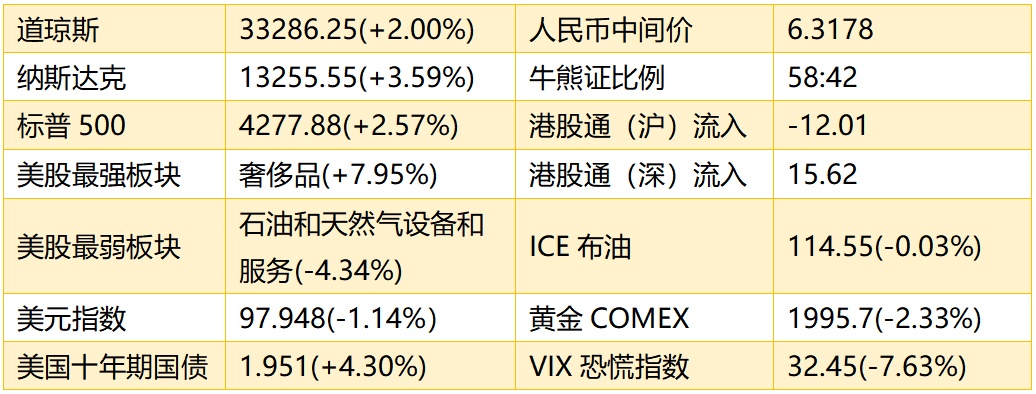 1.隔夜美股收盘,道指收盘上涨653.61点,涨幅为2.00%,报33286.25点;纳指涨459.99点,涨幅为3.59%,报13255.55点;标普500指数涨107.18点,涨幅为2.57%,报4277.88点,创2020年6月以来最大单日涨幅。三大股指均打破连续四个交易日的下跌趋势。港股ADR指数上涨,按比例计算,收报20937点,较香港收市涨310.43点,幅度为1.48%。纳斯达克金龙中国指数收盘上涨6.4%,创五周最大单日涨幅。