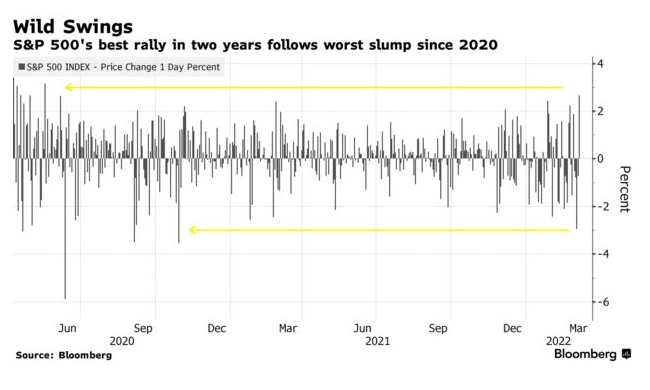 周三,标准普尔500指数迎来了2020年以来最大涨幅,此前遭受重创的银行股,随着交易员纷纷买入看涨期权,股价突然飙升。投资者对乌克兰局势、经济增长前景、主要央行政策、以及疫情有很多担忧,因此市场波动巨大,尽管散户还在趁机抄底,但机构投资者更为谨慎。