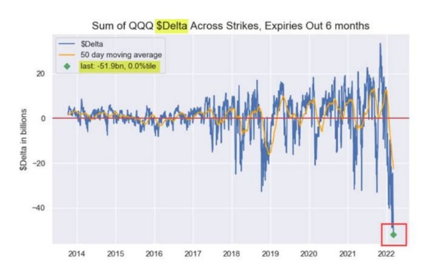 期权交易商也助长了行情恶化,他们一直需要在股票上涨时买进,下跌时卖出,以保持中性敞口。据野村控股跨资产策略师Charlie McElligott估计,截至周二,他们对标普500产品的delta敞口位于历史区间的底部0.2%,而纳斯达克的delta敞口至少是2014年以来的最低水平。