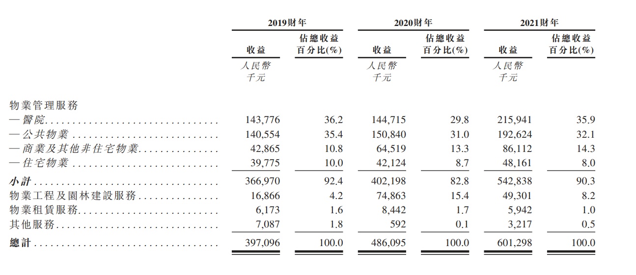 就物业管理服务而言,2020财年,该公司有30家在管医院及95个在管公共物业。根据弗若斯特沙利文报告,按2020年各板块所产生的收益计,在山东省物业管理服务供应商中,公司在医院及非住宅(包括医院、公共物业及商业物业)板块分别位列第二及第三,分别约占市场份额的5.6%及1.8%。就整体中国物业管理行业各领域产生的收益而言,公司于医院领域的市场份额分别约为0.5%及于非住宅(包括医院、公共物业及商用物业)的市场份额约为0.3%。