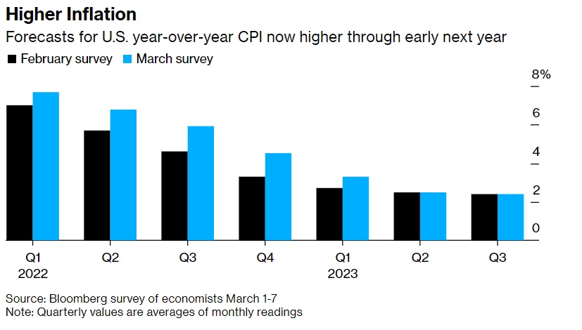 美国2月CPI数据还将显示出汽车、家具和住房等价格的走向,正是这些商品价格导致俄乌冲突前美国通胀的持续走高。其中,包括租金在内的住房成本一直在稳步上升,且预计这一趋势将在可见的未来持续下去,CPI可能将在晚些时候见顶。3月1日至7日经济学家的月度预测数据显示,受访经济学家预计2022年第一季度CPI同比平均增幅为7.7%,高于2月份调查时的7%;他们预计今年最后三个月CPI将上涨4.5%,比上个月的预测高出一个多百分点。