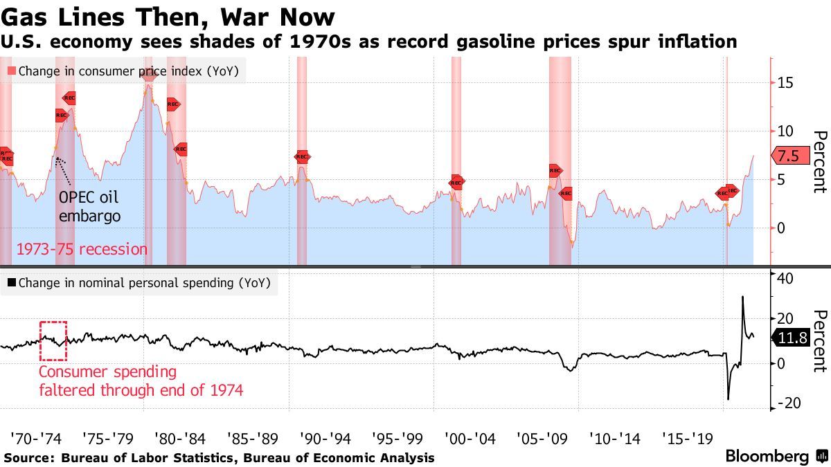 在俄乌冲突升级之后,大宗商品价格出现了历史性飙升,再加上本已高企的通胀率,这让一些投资者和经济学家开始寻找与40年前的能源冲击以及随之而来美国经济增长长期放缓的相似之处。