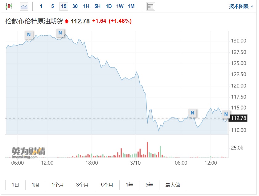 截至发稿,5月布伦特原油期货涨1.48%,报112.78美元/桶。