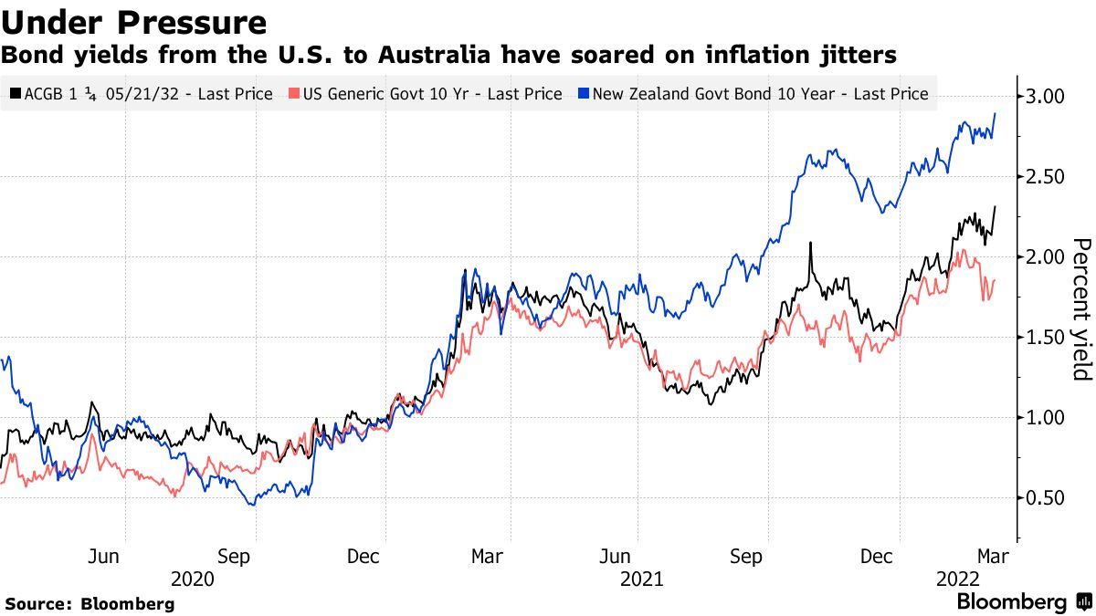 在美联储与自上世纪80年代以来最严重通胀作斗争之际,有关各大央行加息幅度和速度的预期一直主导着金融市场。美国国债价格录得40年来最差表现,澳大利亚国债收益率飙升,甚至受到严格控制的日本国债也面临抛售压力,因对冲基金纷纷抛售对通胀敏感的资产。