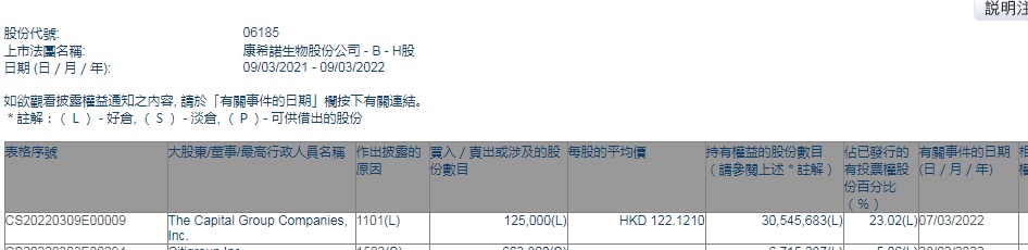 智通财经APP获悉,香港联交所最新资料显示,3月7日,美国资本集团增持康希诺生物-B(06185)12.5万股,每股作价122.121港元,总金额约为1526.51万港元。增持后最新持股数目约为3054.57万股,最新持股比例为23.02%。