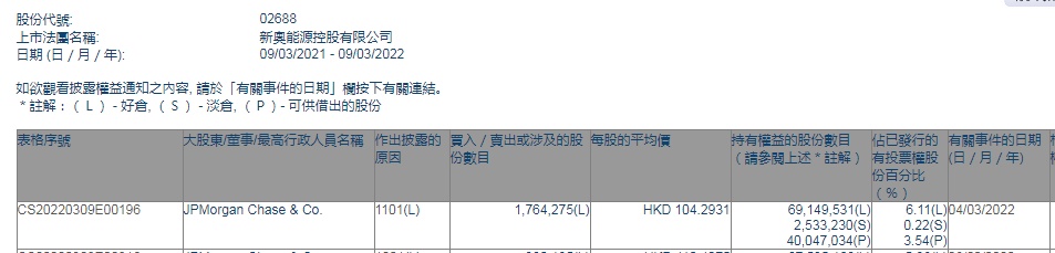 智通财经APP获悉,香港联交所最新资料显示,3月4日,小摩增持新奥能源(02688)176.4275万股,每股作价104.2931港元,总金额约为1.84亿港元。增持后最新持股数目约为6914.95万股,最新持股比例为6.11%。