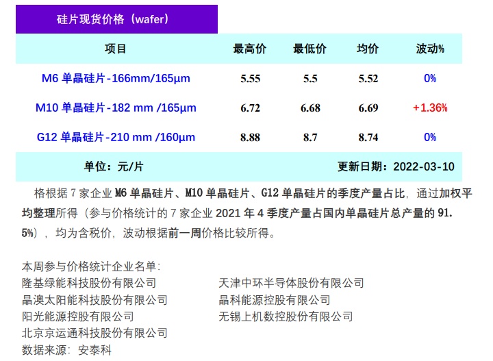 智通财经APP获悉,据硅业分会数据显示,本周M6单晶硅片(166mm/165μm)价格区间在5.5 5-5.55元/片,成交均价维持在5.52元/片,周环比持平;M10单晶硅片(182 mm /165μm)价格区间在6.68-6.72元/片,成交均价提升至6.69元/片,周环比涨幅为1.36%;G12单晶硅片(210mm/160μm)价格区间在8.7-8.88元/片,成交均价维持在8.74元/片,周环比持平。本周价格涨幅收窄的主要原因是需求端小幅下滑。