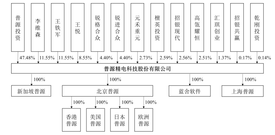 截至IPO前,该公司的实际控制人为王悦,直接持有普源精电8.55%的股份,通过控制的普源投资控制普源精电47.48%的股份,同时王悦通过其控制并担任执行事务合伙人的锐格合众、锐进合众合计控制普源精电8.79%的股份。