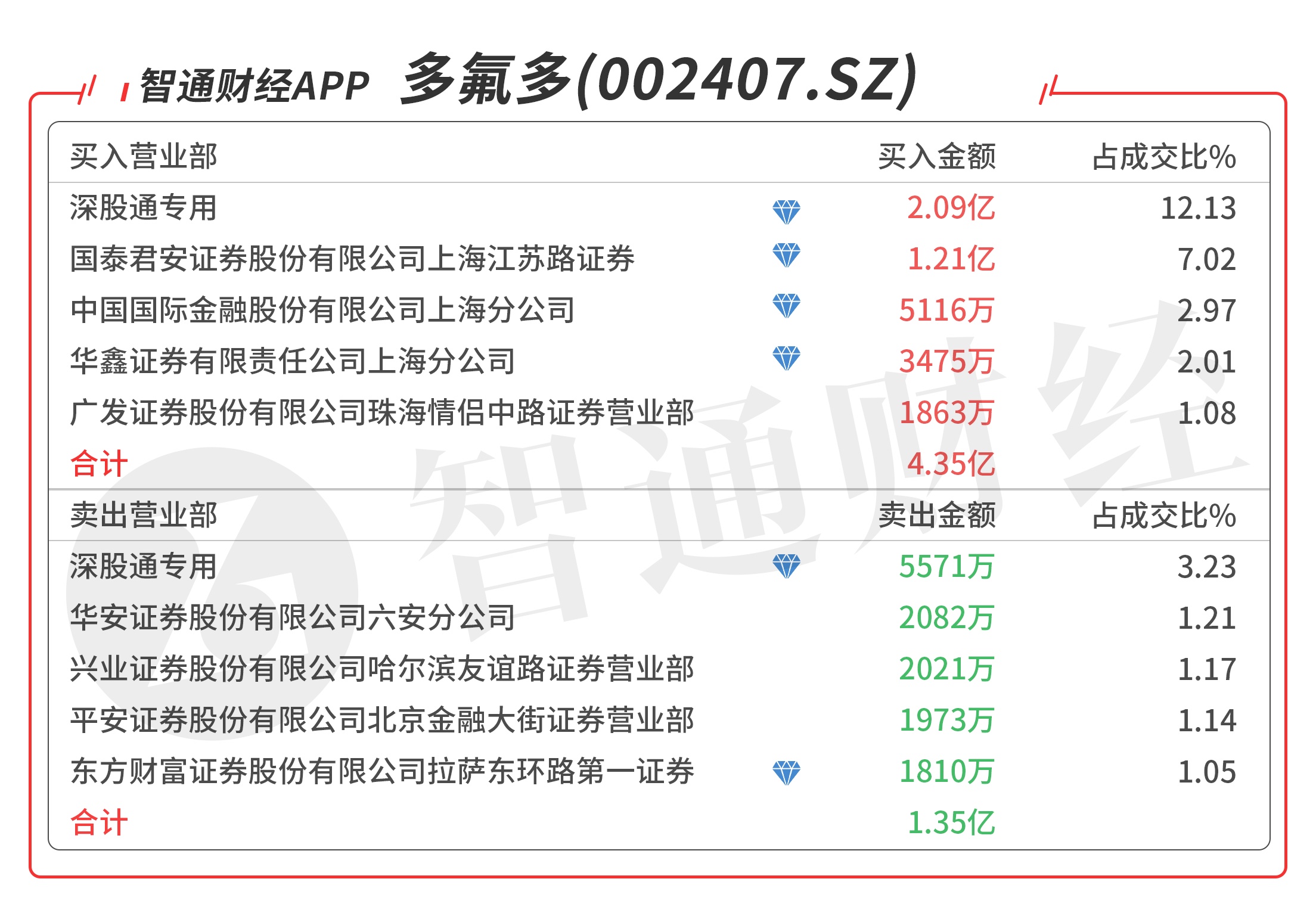 多氟多(002407.SZ):龙虎榜阵容豪华,深股通对倒净买入1.54亿元,买二是知名游资章盟主的席位买入1.2亿元,买四是知名游资的席位买入3269万元,当日净买入3.07亿元,该股今日底部首板,跳空高开强势涨停,预计压力位在年线附近。