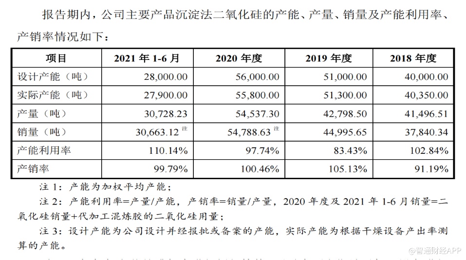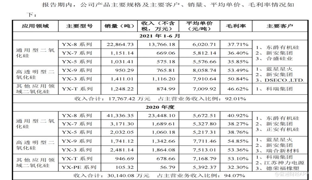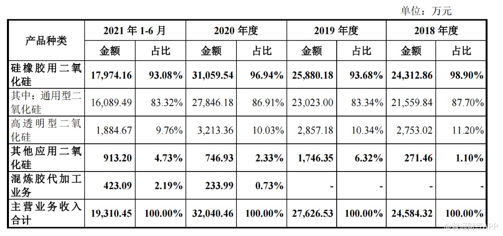 报告期内(2018年、2019年、2020年及2021年上半年,下同),公司的收入主要来源于沉淀法二氧化硅产品的销售,2021年上半年公司主营业务收入占总收入的比重为99.84%。