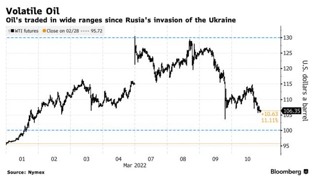 纽约期货交易价格下跌2.5%,周四交易区间为9美元。当天,无论是OPEC+还是俄罗斯和乌克兰之间的冲突都没有什么新进展,更广泛的市场走势成为焦点,油价与美元呈现出典型的反向关系。随着美元升值,以美元计价的商品变得更便宜。周四,俄罗斯和乌克兰外长在土耳其会面,但会议没有取得任何成果。