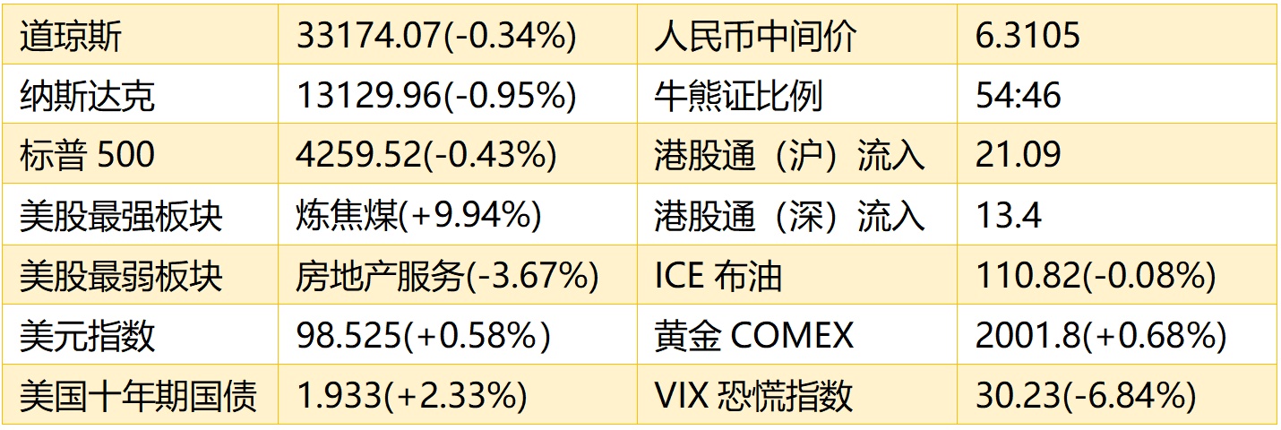 1.隔夜美股收盘,道指下跌112.18点,跌幅为0.34%,报33174.07点;纳指跌125.58点,跌幅为0.95%,报13129.96点;标普500指数跌18.36点,跌幅为0.43%,报4259.52点。纳斯达克金龙中国指数收跌超10%,创2008年10月以来最大跌幅。港股ADR指数下跌,按比例计算,收报20427点,较香港收市跌463.38点,幅度为2.27%。