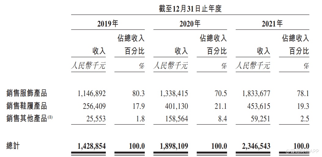 从产品结构上看,子不语以服装为主,鞋履产品为辅,并逐渐向包括电子设备、文具以及体育用品在内的其他产品发力布局。据招股书显示,2021年时,子不语来自于服装、鞋履、其他产品的收入占比分别为78.1%、19.3%、2.5%,服装收入占绝对大头,其他产品的收入占比仍较小。