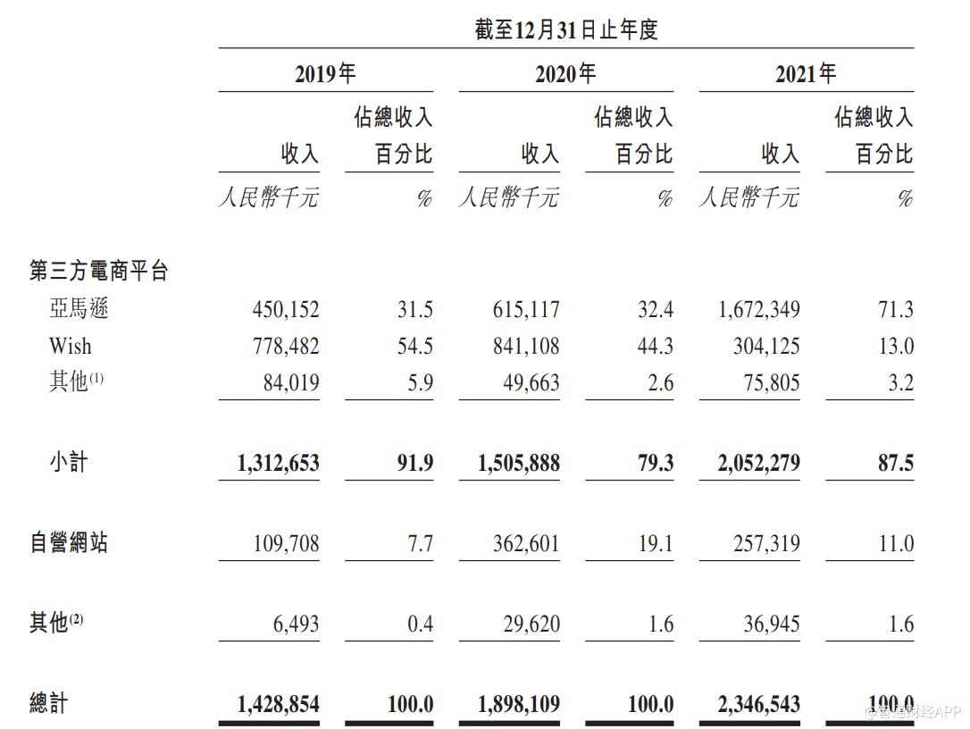 从渠道来看,子不语从第三方电商平台逐渐向自营发力,其于2018年推出了自营网站,但目前来看,第三方电商平台仍是子不语的核心销售渠道。据招股书显示,2021年时,子不语来自包括亚马逊、Wish、eBay、全球速卖通等在内的第三方电商平台的收入占比高达87.5%,其中来自亚马逊的收入占比为71.3%,同比提升近40个百分点;而来自自营网站的收入占比降至11%。