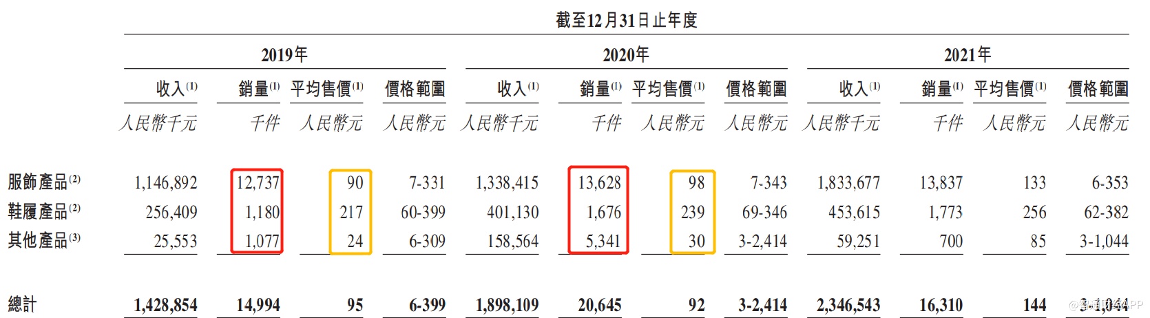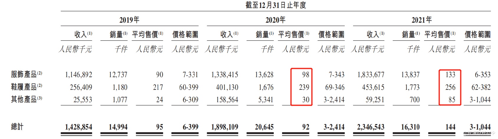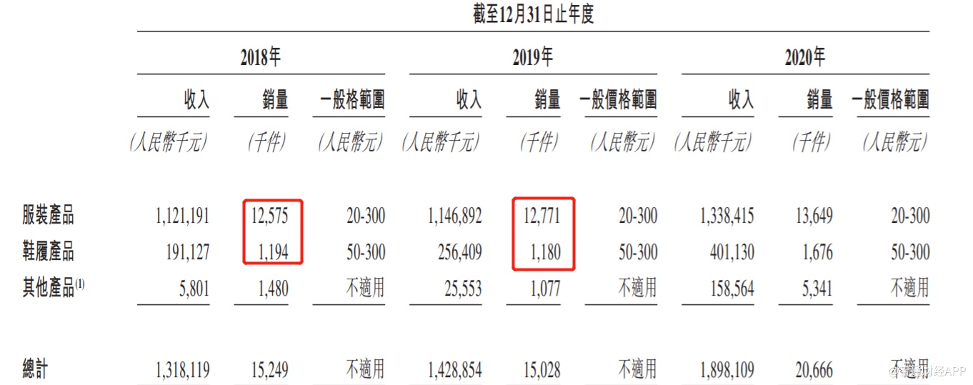若详细对比子不语自2018年以来的产品销量,便可发现该公司收入持续增长的秘密。智通财经APP发现,2019年时,子不语的收入仅增长8.42%至14.29亿元,增速仅单位数,这主要是因为在该年内服装、鞋履的产品销量几乎未增长,靠的是产品价格的提升带动了整体收入增长。