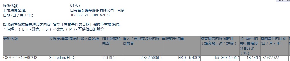 智通财经APP获悉,香港联交所最新资料显示,3月8日,Schroders Plc增持山东黄金(01787)284.25万股,每股作价15.4802港元,总金额约为4400.25万港元。增持后最新持股数目约为1.56亿股,最新持股比例为18.14%。