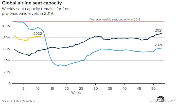 OAG在3月7日的报告中表示,全球航空公司一周的飞机座位数为8200万,总体运力比2019年同期低23%。