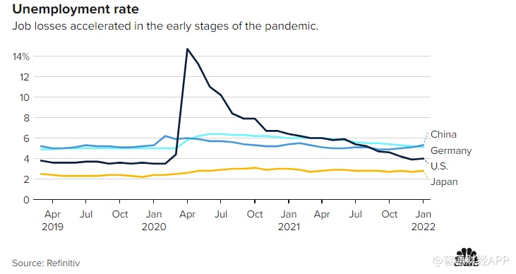 以2019年12月的数据为基准,德国的失业率基本回到了新冠疫情前的水平。日本和美国的失业率仍略有上升。