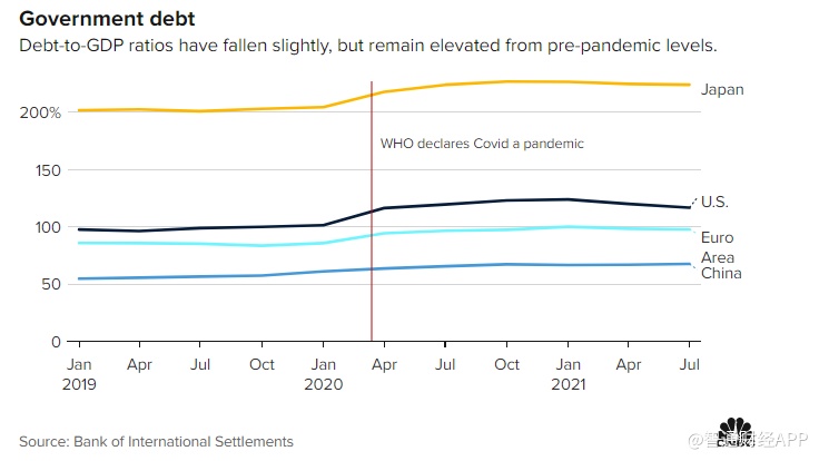 根据国际清算银行(Bank of International Settlements)的数据,政府债务与国内生产总值(GDP)的比值有所攀升,而且仍高于新冠疫情前的水平。