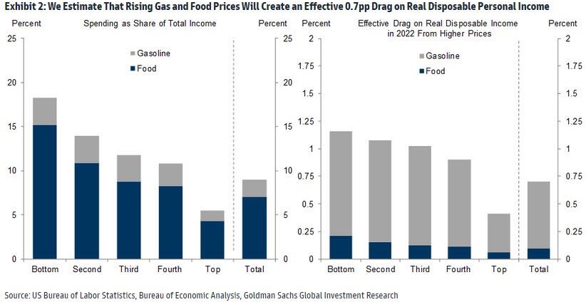 这些经济学家在报告中写道,这一预估值意味着低于2022年第一季度和第二季度的潜在增长以及2022年的整体潜在增长。这些经济学家们并补充称,石油和农产品价格上涨将对可支配收入构成压力。Hatzius表示:“自俄罗斯入侵乌克兰以来,石油和大宗商品价格大幅上涨。我们的大宗商品策略师对近期原油和农产品的预测显示,实际可支配收入将减少0.7%,这将拖累2022年的支出。”