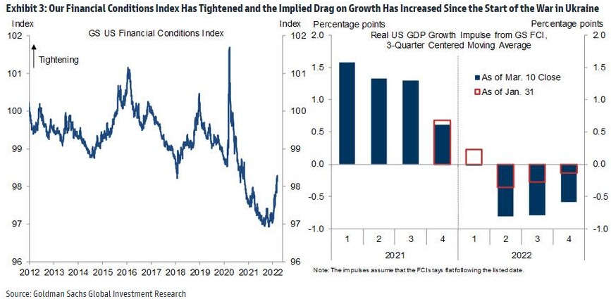 高盛指出,由于大宗商品价格和利率飙升,全球金融环境突然陷入了过去十年来最紧张的状态。该投行还预计,金融环境进一步收紧、消费者信心下降和欧洲经济增长放缓,将对美国经济增长造成拖累。高盛还认为,如果关键金属的短缺限制了美国的生产,美国经济将面临更多的下行风险。