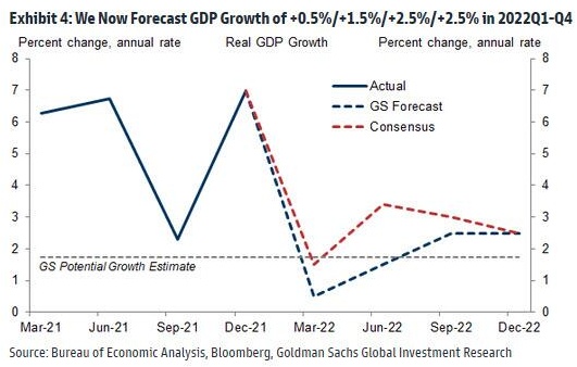 相比之下,这是高盛去年10月份的预测:2022年第一季度为4.5%,之前为5.0%;2022年第二季度增长至4%,之前为4.5%;2022年第三季度为3%,此前为3.5%;2022年第四季度为1.75%,之前为1.5%。换句话说,短短5个月内,高盛已经将其对美国2022年一季度的增长预期从5.0%下调到了0.5%。这一次,已经是该行自去年7月以来第7次下调美国经济增长预期。