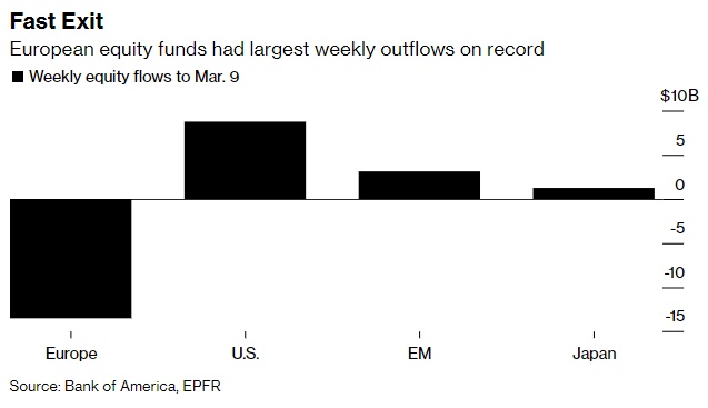 分析师援引EPFR Global的数据称,截至3月9日的一周时间内,欧股基金已损失135亿美元的资金,是前一周纪录的两倍。由迈克尔•哈特尼特(Michael Hartnett)领导的策略师团队认为,这是在对欧洲说“不”,因为欧洲大陆地区是投资者减持股票的主战场。在减持的同时,他们买入了美国、日本和新兴市场的股票,其中美股吸引了四周以来最强劲的资金流入,达到88亿美元。
