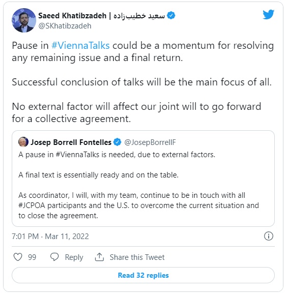 对此,伊朗外交部发言人Saeed Khatibzadeh表示,谈判暂停可能为解决阻碍协议达成的问题提供“动力”。他表示:“没有外部因素会影响我们推进集体协议的共同意愿。”