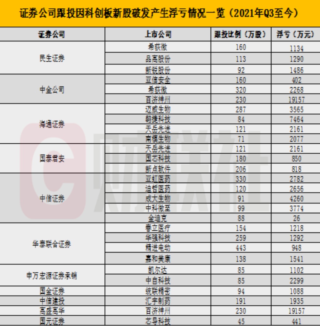 或受破发影响,11家券商通过相关子公司跟投浮亏共计高达8.94亿元,其中,中金公司浮亏最多,达到2.2亿元,海通证券浮亏1.5亿元,中信证券浮亏1.4亿元,高盛高华浮亏1.9亿元,华泰证券浮亏4999万元,民生证券浮亏3910万元,国泰君安浮亏3829万元。