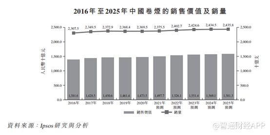 尽管控制吸烟的法规有所收紧,但Ipsos预计中国的吸烟者人数预计将稳定在约3亿人,香烟的销量预计将从2022年的约24027亿支增加到2025年的24358亿支,复合年增长率约为0.5%。