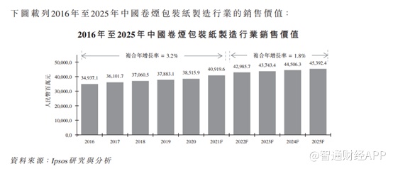 卷烟包装纸作为卷烟行业中重要的一环,销售价值由2016年的约349.37亿元增加至2021年的409.2亿元,复合年增长率约为3.2%。中国卷烟包装纸制造行业的销售价值经预测将由2022年的约429.86亿元增加至2025年的453.9亿元,复合年增长率约为1.8%。