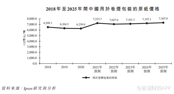 造纸木浆是卷烟包装所用原纸的另一项主要原材料,而由于造纸木浆价格上涨,生产卷烟包装纸所用原纸的价格由2018年约每吨6509.1元增加至2021年的每吨7223.7元,复合年增长率约为3.5%。