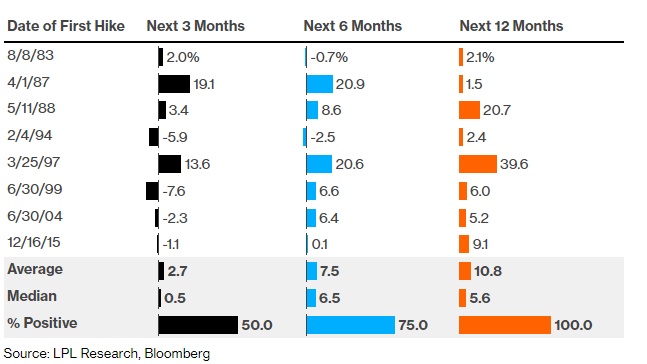 历史经验表明,美股在利率上升后将经历更大的波动,但这并不意味着牛市已经结束。事实上,根据LPL Financial的数据,在之前的8个加息周期中,标普500指数在每次首次加息后的一年时间里都会有所上升。