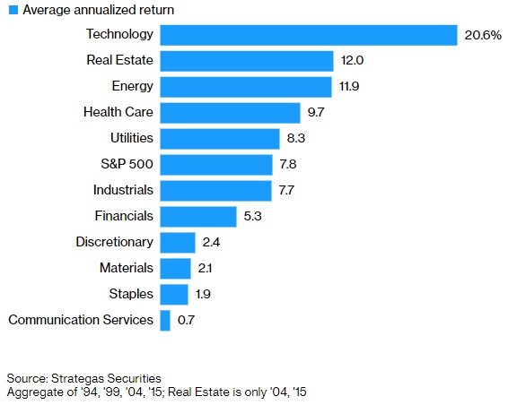 在过去30年里,美联储经历了四个截然不同的加息周期,但没有一次给股市带来消极影响。而根据Strategas Securities的数据,在这四个周期中,科技类股通常是表现最好的标普500类股之一,涨幅接近21%。