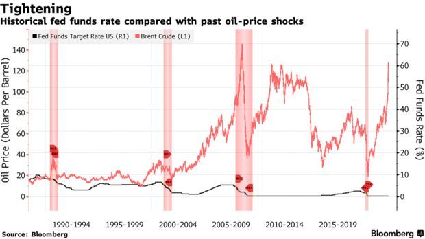 美联储目前陷入了两难境地:在供应不足导致油价持续上涨之际,俄乌冲突可能会进一步推高油价。在上世纪70年代中期、80年代初和90年代初,石油危机都是经济衰退的前兆。不过,其他经济衰退,比如2001年9/11事件和2008年全球金融危机,都不是由石油价格急剧上涨直接造成的。