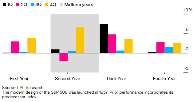 LPL Financial的数据显示,总体来看,中期选举年均出现了较大的年度内跌幅,平均跌幅超过17%;从历史上看,本季度和接下来的两个季度将是当前这个四年总统任期中股市表现最弱的时间。