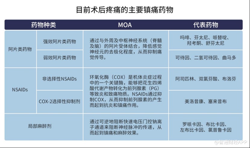 目前市场上常见的术后镇痛药物主要包括阿片类,非甾体类抗炎药(NSAIDs)及局部麻醉药物等。