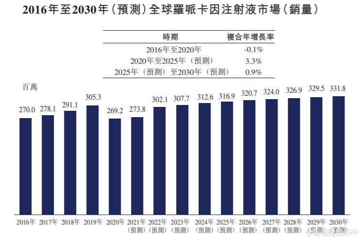 目前全球范围内获批准的罗哌卡因均为罗哌卡因注射液。2016年至2019年,全球罗哌卡因注射液市场规模(以销量计)由2.70亿稳步上升至3.05亿。并预计在2025年及2030年分别达到3.17亿及3.32亿。2020年至2025年的复合年增长率为3.3%,2025年至2030年的复合年增长率为0.9%。