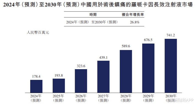 从罗哌卡因长效注射液的市场前景来看,根据药物申请时间表,估计第一款用于术后镇痛的罗哌卡因长效注射液或将于2024年在中国获批准。2024-2030年,预计中国用于术后镇痛的罗哌卡因长效注射液潜在市场规模将由人民币1.78亿元增加至7.41亿元,复合年增长率为26.8%。