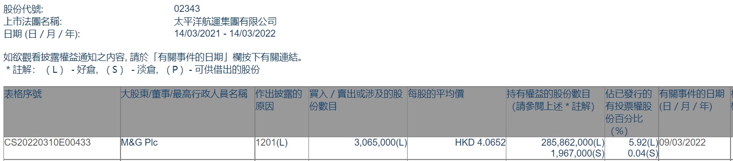 智通财经APP获悉,香港联交所最新资料显示,3月9日,M&G Plc减持太平洋航运集团有限公司(02343)306.5万股,每股作价4.0652港元,总金额约为1245.98万港元。减持后最新持股数目约为2.86亿股,最新持股比例为5.92%。