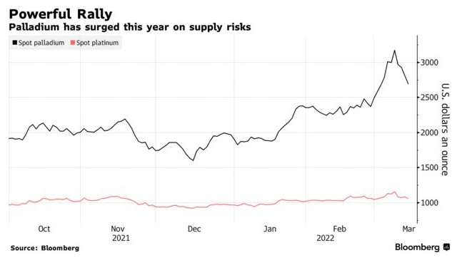 钯金在俄乌冲突升级后的疯狂走势可能还没有结束。但由于有迹象显示钯金出口将保持不变,且汽车制造商的需求可能受到影响,今年钯金的惊人涨幅看上去很脆弱。
