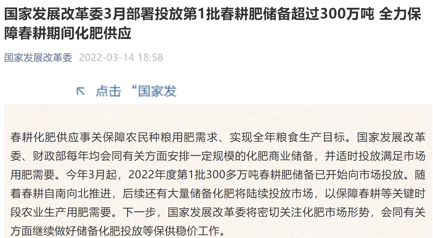 智通财经APP获悉,发改委公众号发文称,春耕化肥供应事关保障农民种粮用肥需求、实现全年粮食生产目标。国家发展改革委、财政部每年均会同有关方面安排一定规模的化肥商业储备,并适时投放满足市场用肥需要。今年3月起,2022年度第1批300多万吨春耕肥储备已开始向市场投放。随着春耕自南向北推进,后续还有大量储备化肥将陆续投放市场,以保障春耕等关键时段农业生产用肥需要。下一步,国家发展改革委将密切关注化肥市场形势,会同有关方面继续做好储备化肥投放等保供稳价工作。