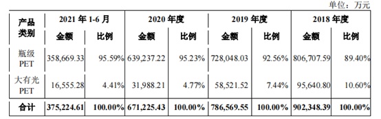 据智通财经APP了解,瓶级 PET收入为公司主要收入来源,2018年、2019年、2020年及2021上半年,该分部收入分别为80.67亿元、72.80亿元、63.92亿元及35.87亿元,占主营业务收入的比重分别为89.4%、92.56%、95.2%及95.59%。