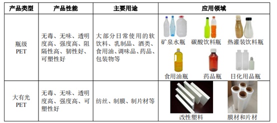 瓶级 PET 是环保高分子聚酯材料,具有无毒、无味、透明度高、强度高、阻隔性高、韧性好、可塑性好等特性,瓶级 PET 广泛应用于包括软饮料、乳制品、酒类、食用油、调味品、日化、电子产品、医疗医药、现场制作饮品、生鲜果蔬等多种领域,是目前全球范围内应用最广泛的包装材料之一,主要产品形态为塑料包装容器或外壳。