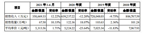 而随着公司产能的扩张及下游行业需求量的增长,公司的产品销量保持稳中有升的趋势,于报告期内,分别实现101.24万吨、103.63万吨、122.36万吨及67.50万吨。