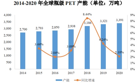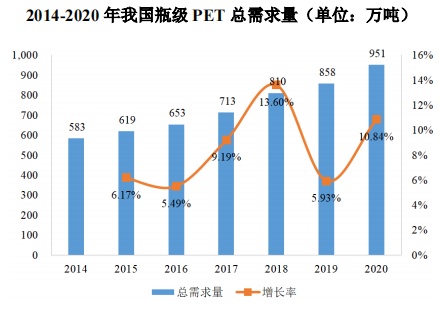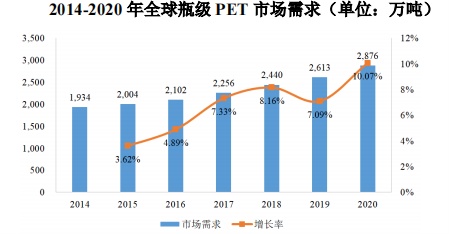 由于瓶级 PET 具有良好的性能,应用范围广,全球需求量稳步增长。2014-2020 年间,全球瓶级 PET 市场需求从 1934 万吨增长至 2876 万吨,年复合增长率为 6.84%,总体高于同期全球瓶级 PET 产能及产量增长率,且从 2015 年开始呈现出加速增长趋势,显示出瓶级 PET 作为新型的环保性包装材料具有良好的市场前景。