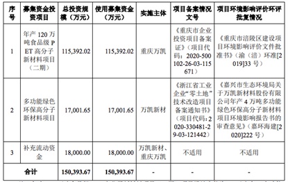为了抓住全球聚酯产品及瓶级 PET 下游应用需求升级的市场机遇,本次上市,公司拟募集15.04亿元。其中11.54亿元将投入到年产120万吨食品级PET高分子新材料项目(二期),1.70亿元用于多功能绿色环保高分子新材料项目,剩余的1.8亿元将用于补充流动资金。