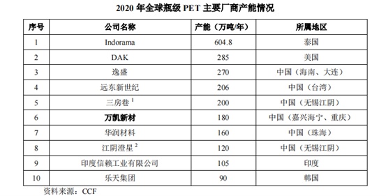 其实我国瓶级 PET 行业在国家供给侧改革政策及行业自发性去产能的影响下,进入调整阶段,市场竞争力较弱的小规模企业被淘汰。经过调整后,从 2017 年开始,我国瓶级 PET 行业由万凯新材、华润材料等行业领先企业带领进入新一轮的产能扩张期。截至 2020 年末,中国大陆地区企业三房巷、华润材料、逸盛、万凯新材以及澄高包装进入全球瓶级 PET 产能前十之列,合计产能约为 930 万吨/年,占全球产能比例约为 27.43%,可见我国瓶级 PET 行业的产业规模与市场竞争力。其中,自子公司重庆万凯 60 万吨年产能投产以来,目前万凯新材共拥有 180 万吨/年瓶级 PET 产能,产能规模跃居全球前列。